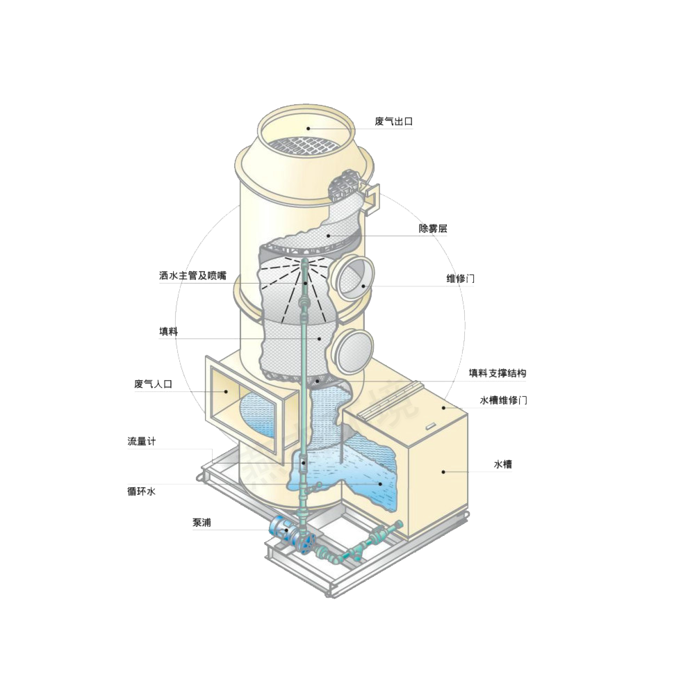 在逆流式噴霧塔中,含塵氣體從噴淋除塵器底部進入,通過氣流分布格柵而均勻地向上運動;液滴由噴嘴噴出從上向下噴淋,噴嘴可以設(shè)在一個截面上,也可以分幾層設(shè)在幾個截面上。因顆粒和液滴之間的慣性碰撞、攔截和凝聚等作用,使較大的粒子被液滴捕集。凈化后的氣體經(jīng)過塔上部的防霧擋水板,除去攜帶的水霧排出。